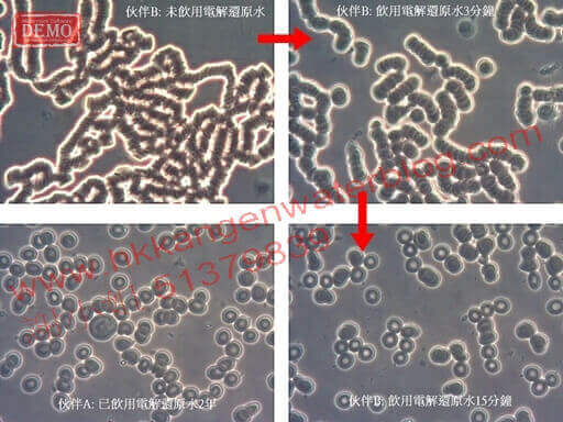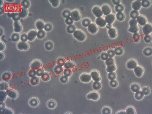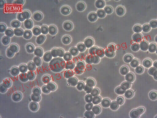 當紅血球有足夠氧氣時,是一粒粒分開,及可變形寄過比它細的微偱環。由於還原水的含氧量比自來水高100倍,所以你會看見紅血球是分開一粒粒的。